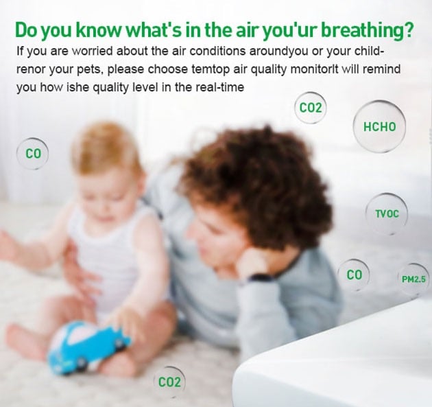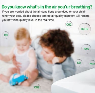 Our air quality monitors allows REAL-TIME accurate monitoring of temperature (in °C), humidity, formaldehyde (HCHO), total volatile organic compounds (TVOC), and micron-sized fine particulate dust (PM2.5), carbon monoxide(CO), carbon dioxide(CO2). Formaldehyde is an environmental carcinogen yet odorless at lower concentrations. Detect low levels of airborne TVOCs not perceivable to the human nose.