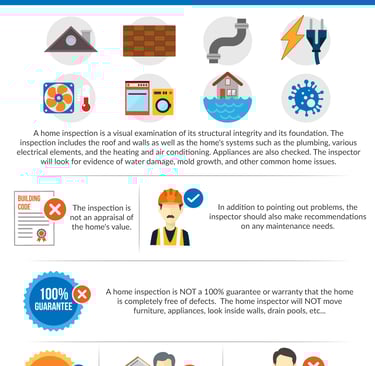 A home inspection is NOT a 100% guarantee or warranty that the home is completely free of defects. The home inspector will NOT move furniture, appliances, look inside walls, drain pools, etc... The home inspection is NOT free. It is NOT done by city inspectors or anybody with a public or government agency. This is a private home inspection for which the buyer pays the inspection fee out of their own pocket to a private home inspection business.